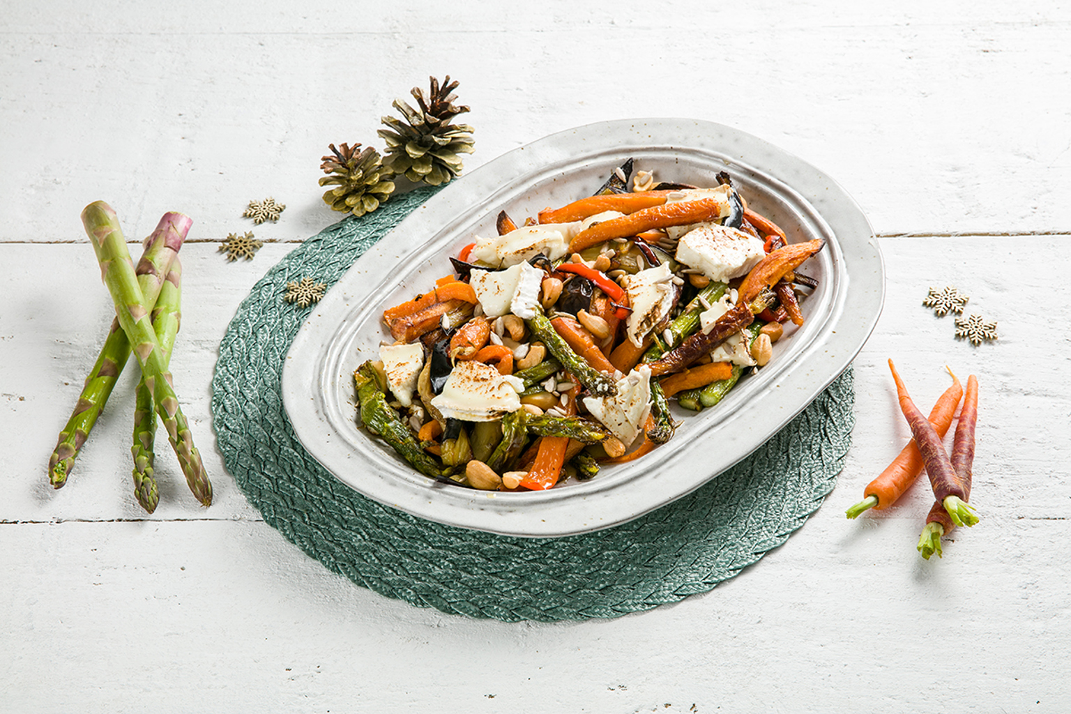 Een lekkere warme salade met allerlei verschillende gegrilde groenten. Leuk om te serveren als bijgerecht bij het kerstdiner, maar ook goed te serveren als klein voorgerecht.