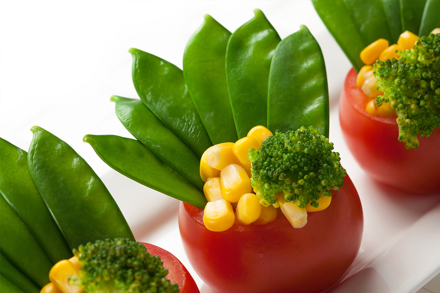 Verwijder de kapjes van de tomaten en verwijder voorzichtig met een theelepel de zaadlijsten. Zet in elke tomaat zes tot zeven peultjes, schep er wat maïskorrels op en een klein broccoliroosjes.