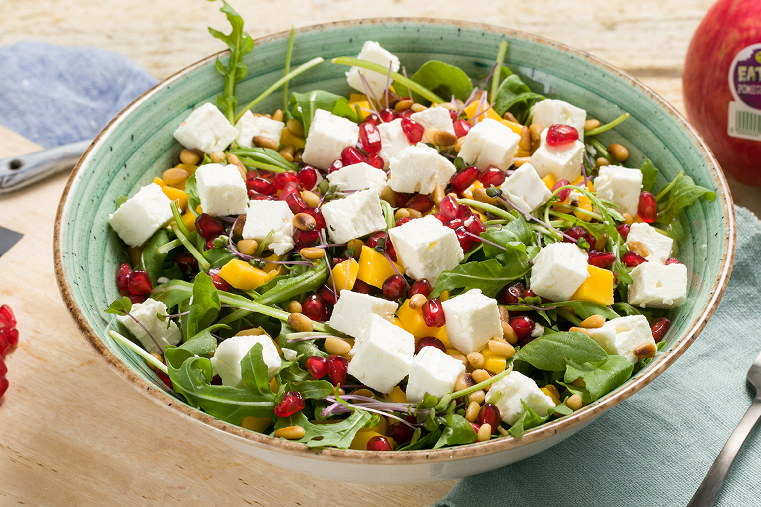 Deze salade is binnen no-time gemaakt en smaakt ook nog eens overheerlijk. De zoete smaak van mango en granaatappel past perfect bij de romige en zoute smaak van feta.