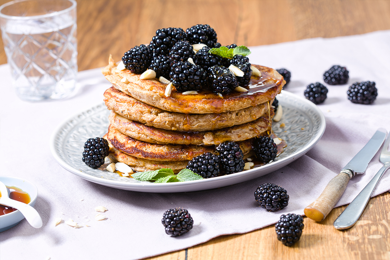 Verhit een koekenpan met antiaanbaklaag op een hoog vuur. Doe wat boter of olie in de pan en bak ca. 8 pannenkoekjes van 12 cm doorsnee. Serveer ze met de bramen en ahornsiroop.