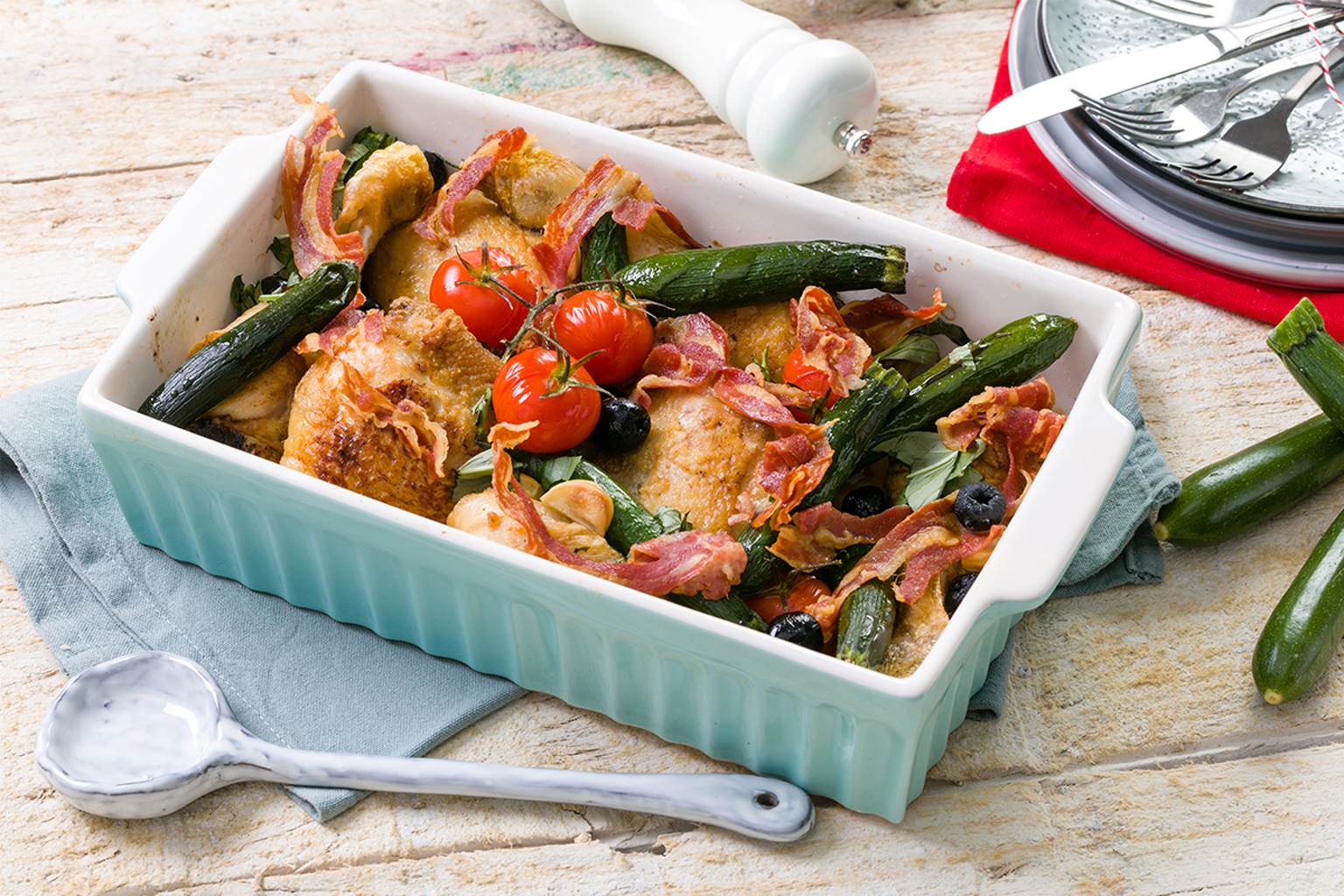Voeg na 20 minuten de mini courgette, olijven, knoflook met schil, pancetta en de cherrytomaten toe en bestrooi met Provençaalse kruiden. Bak nog 25 minuten in de oven of tot de kip gaar is.