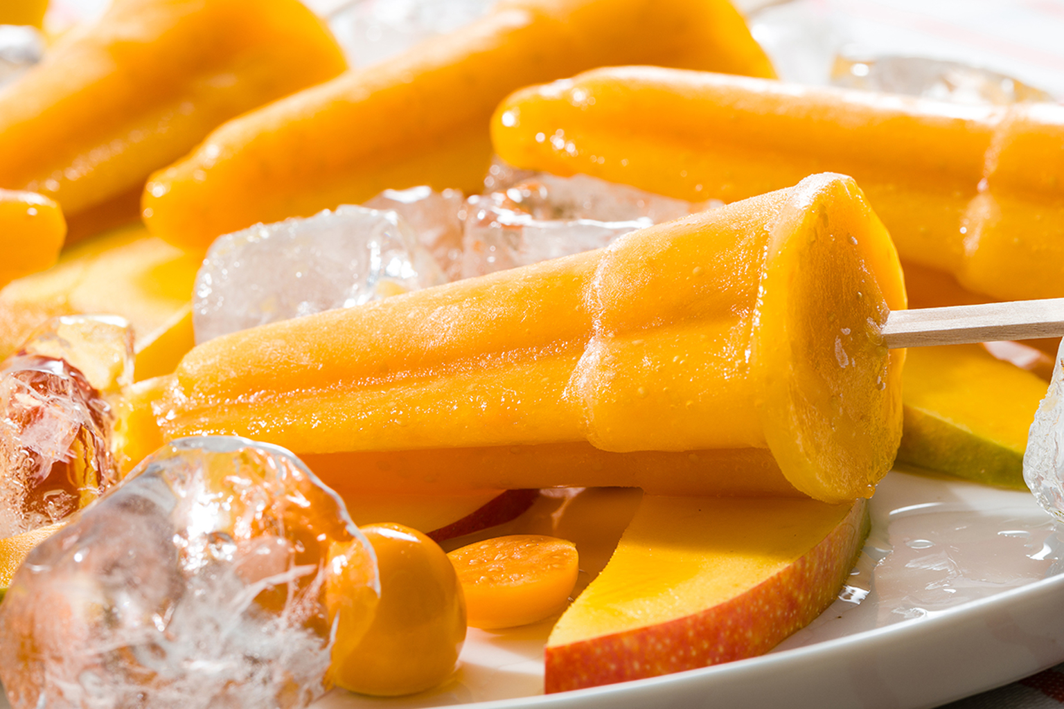 Vul de ijsvormpjes met de mangopuree en zet minimaal 5 uur in de vriezer. Verwijder de vormpjes door ze kort onder warm water te houden.