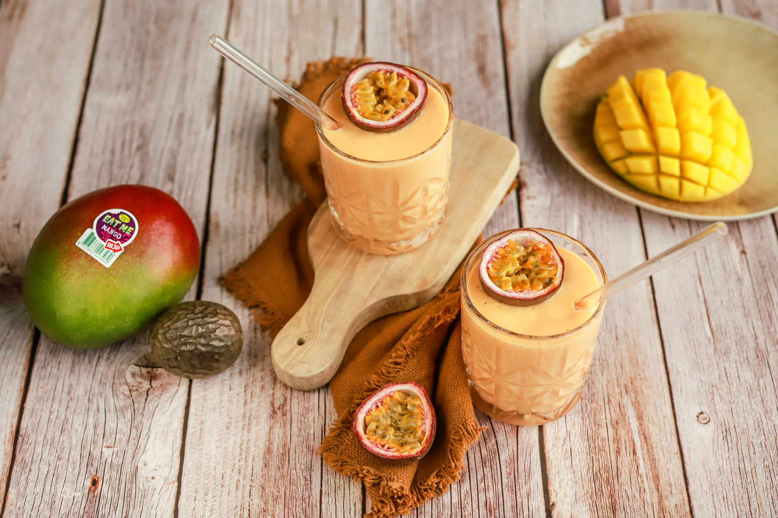 Verdeel de smoothie over 2 glazen. Snijd de passievrucht door de helft en garneer de smoothies met de passievrucht.