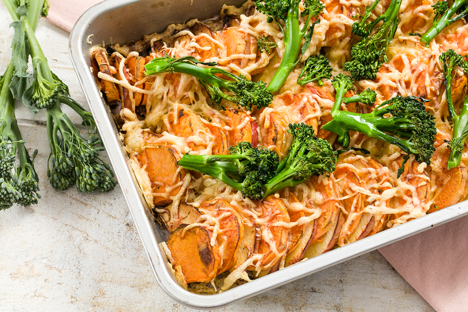 Kook de Bimi® in ca. 3 minuten beetgaar. Laat ze uitlekken en verdeel ze over de ovenschotel.