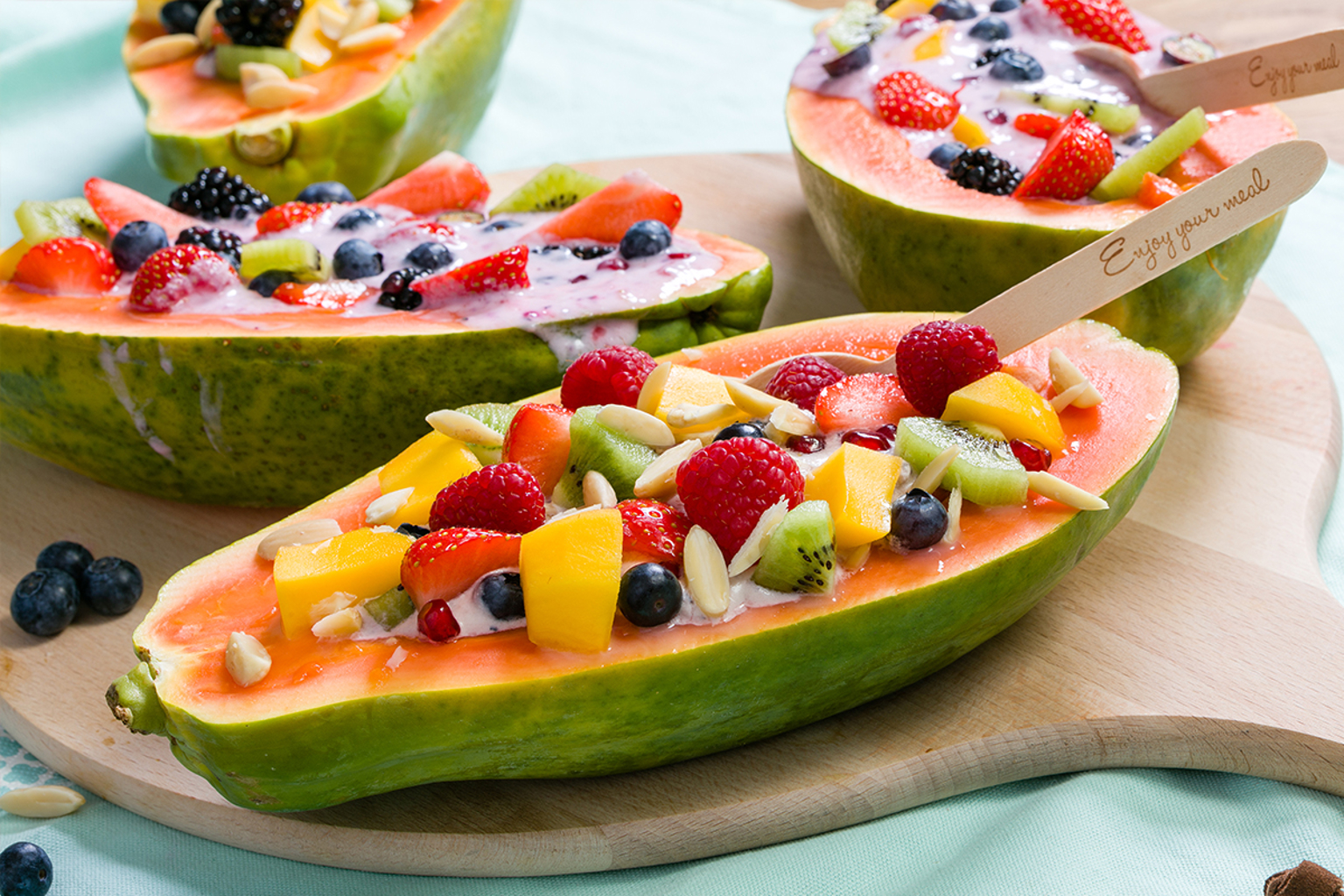 Snijd een stukje van de bolle kant (de onderkant) zodat de bootjes goed blijven staan. Verdeel de yoghurt erover en garneer met fruit naar keuze. Hak de amandelen grof en strooi ze over de papajabootjes.