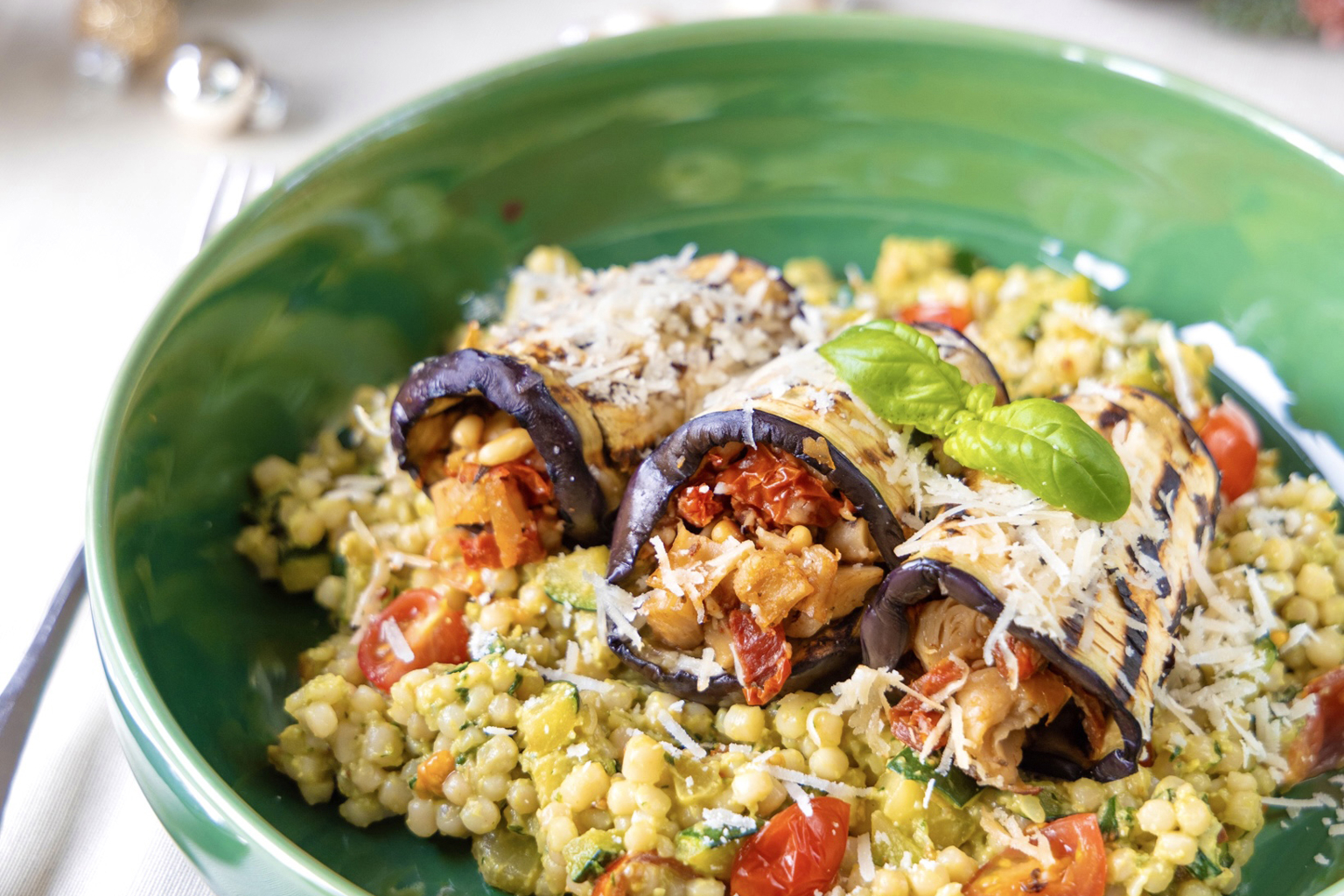 Verdeel de parelcouscous over vier borden. Leg op ieder bord drie auberginerolletjes en strooi er nog wat Parmezaanse kaas en verse basilicum overheen.