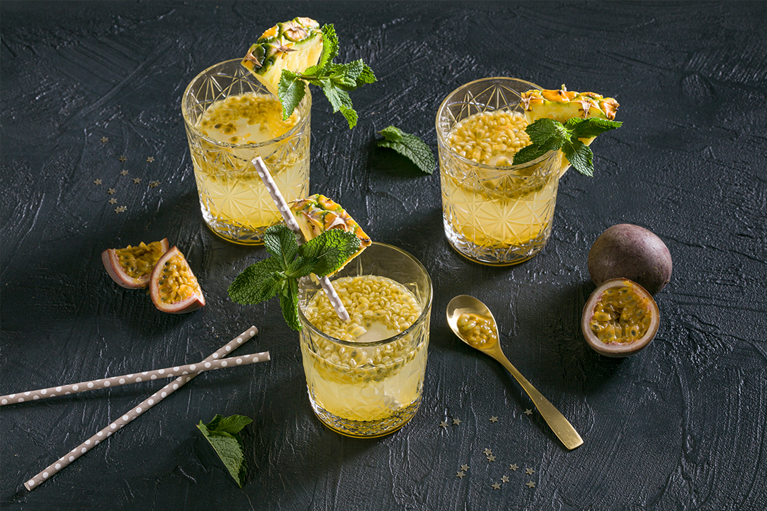 Pers de limoenen uit. Snijd de ananas in stukken en verwijder de schil. Houd 4 mooie stukjes met schil apart voor garnering. Pureer de ananas met het limoensap tot een gladde massa. Halveer de passievruchten en schep met een lepel het vruchtvlees eruit.