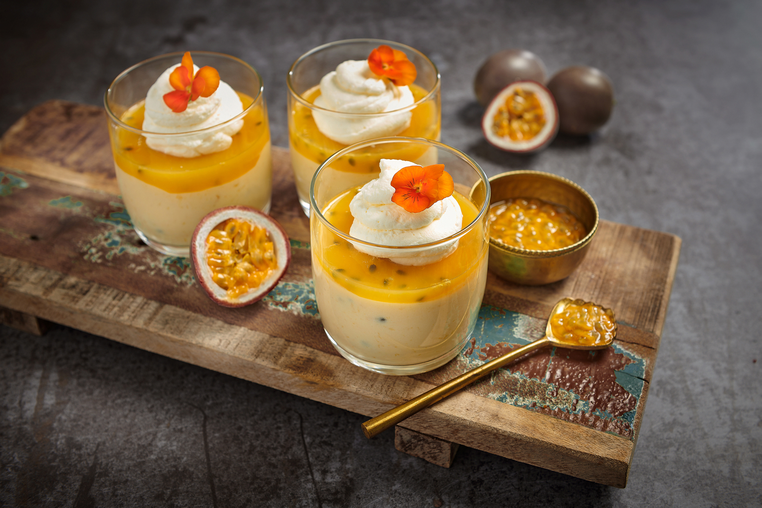 Breng 1/3 van het passievruchtsap met 100 ml sinaasappelsap en 75 gram kristalsuiker in een steelpan aan de kook. Voeg, van het vuur, 4 uitgeknepen gelatineblaadjes toe en roer tot het is opgelost. Laat afkoelen in de koelkast tot het begint te geleren.