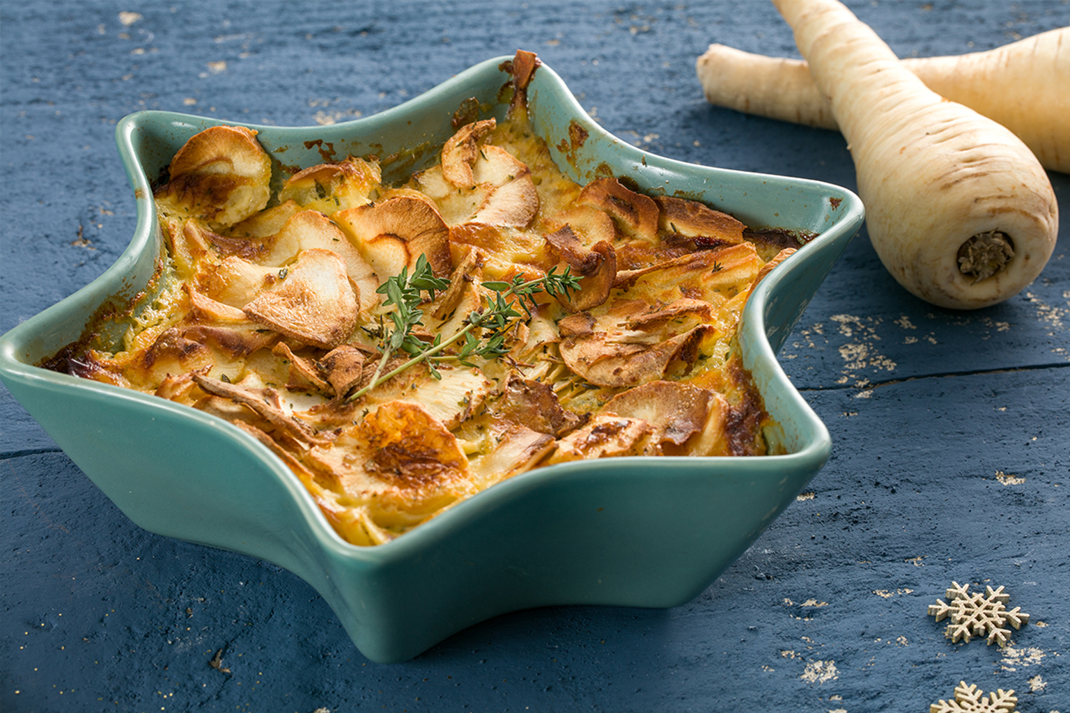 Verdeel de pastinaak in een waaier, dakpansgewijs over de ovenschaal en bestrooi tussendoor met peper en zout naar smaak. Schenk het roommengsel over de pastinaak en bak de gratin in het midden van de oven in ca. 35 minuten goudbruin en gaar.