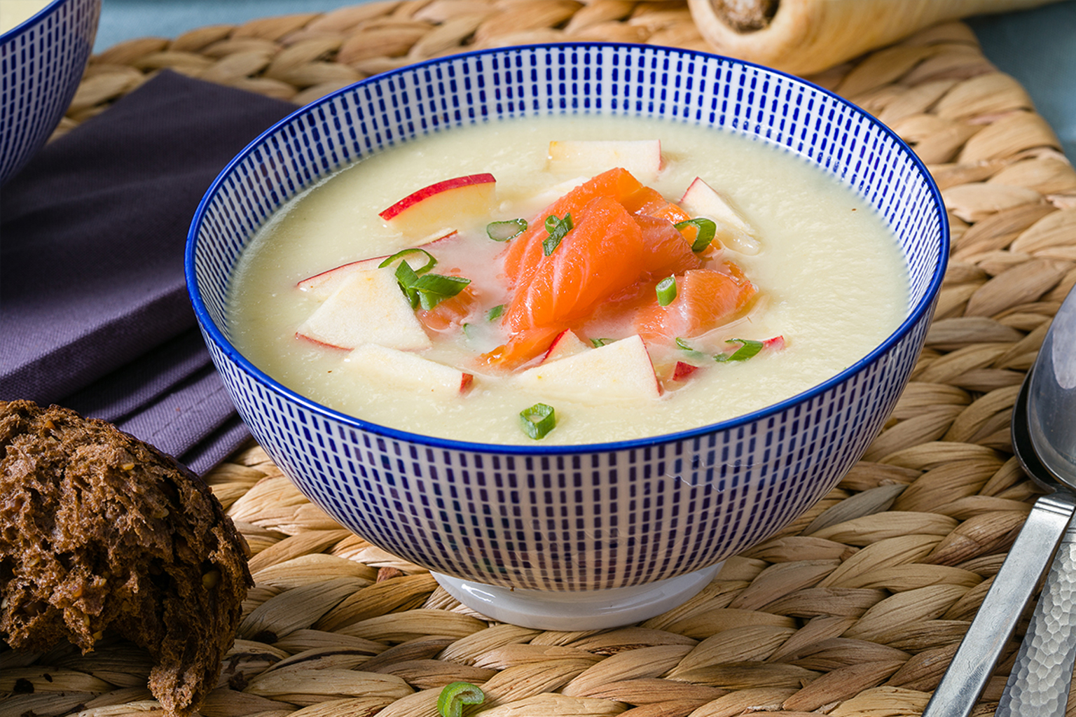 Pastinaak wordt nog wel eens een vergeten groente genoemd, maar is dat eigenlijk allang niet meer. Door de zachte smaak is het een mooie groente om in soep te verwerken en combineert het goed met het frisse van de appel en het zachte van zalm.