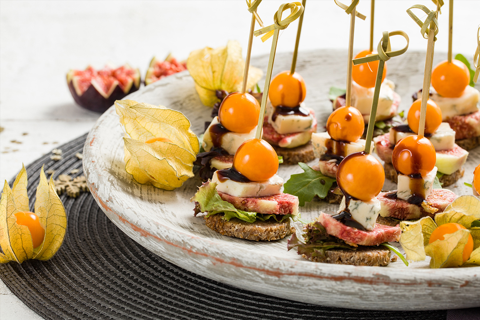 Verwijder het papierachtige omhulsel van de physalis en was ze. Prik alle ingrediënten vast met de tapasprikkers. Besprenkel met de balsamico.