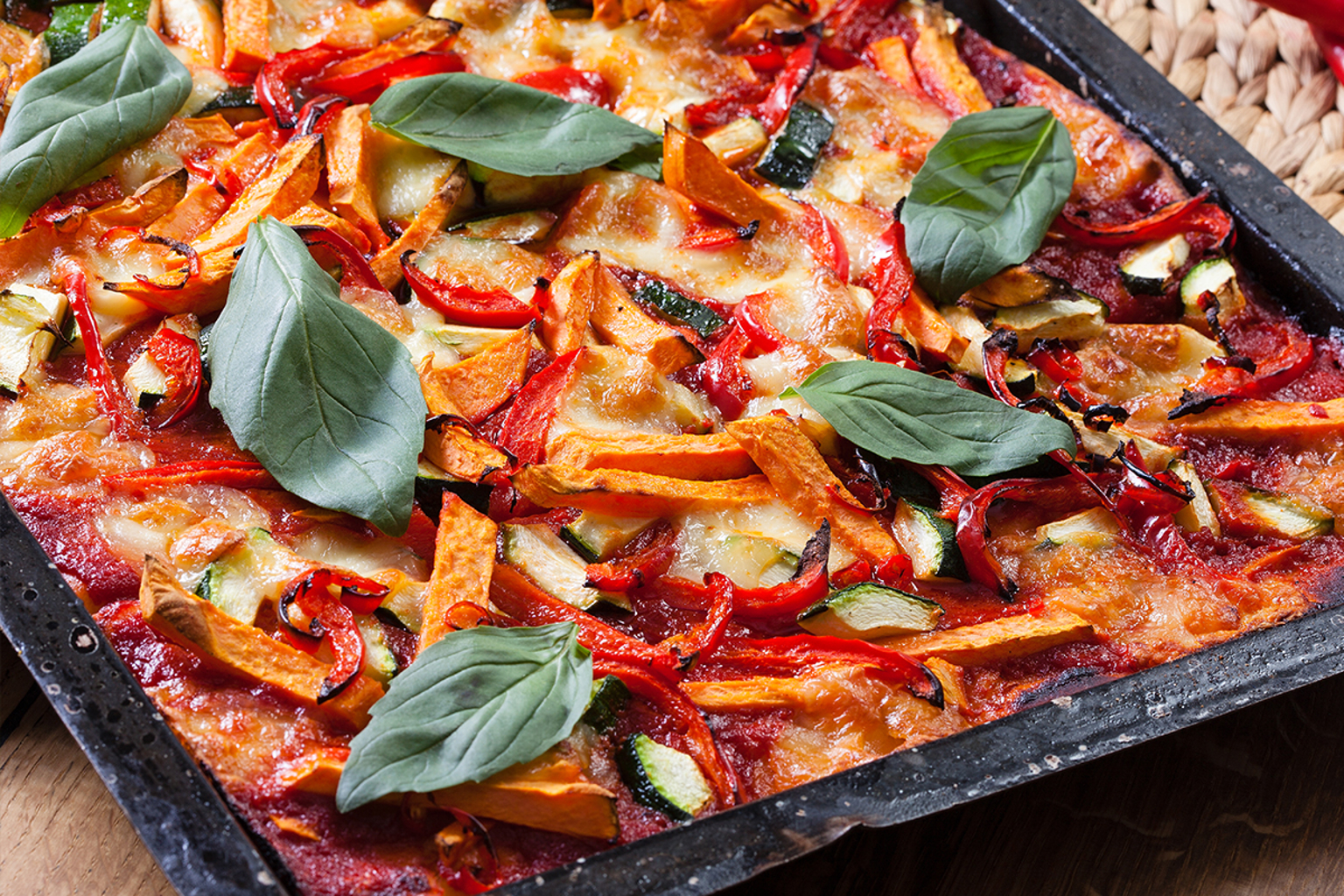 Zelf een heerlijke plaatpizza maken? Deze pizza met zoete aardappel, cayenne peper en basilicum is erg lekker en verrassend. Perfect wanneer er een groep komt eten.