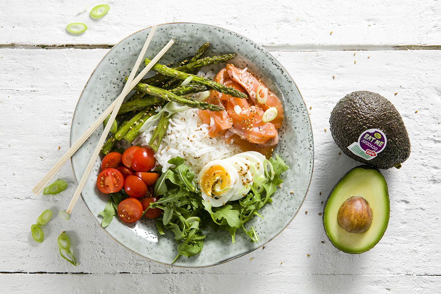 Verdeel de rijst over 4 kommen. Verdeel de asperges, cherrytomaten, eieren, zalm, rucola en sojasaus over de kommen. Bestrooi met sesamzaad en peper en zout naar smaak.