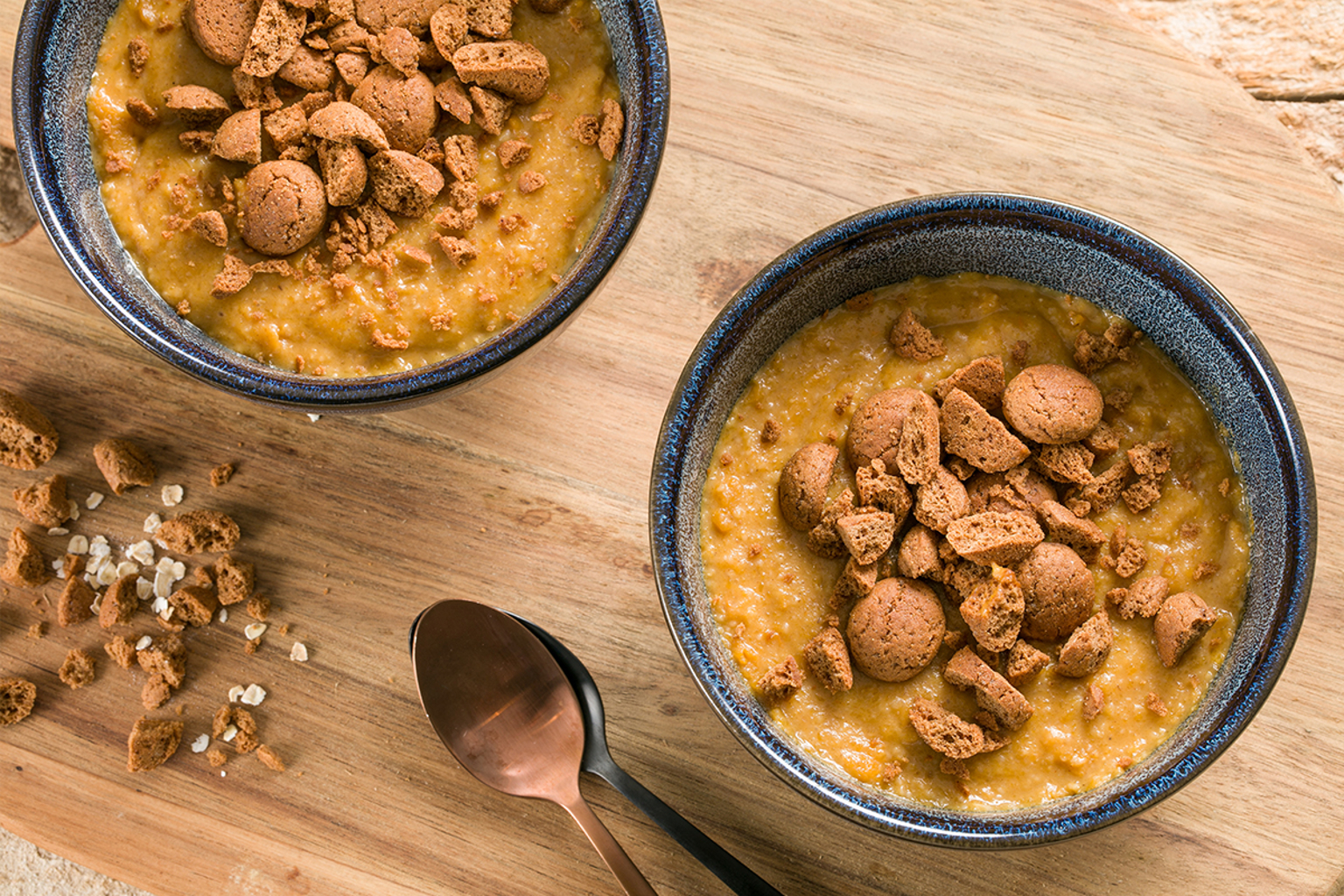 Een lekker en gezond ontbijt maken? Maak pompoenhavermout met een topping van kruidnoten. Liggen er geen kruidnoten meer in de winkel, gebruik dan speculaas of bastognekoeken.