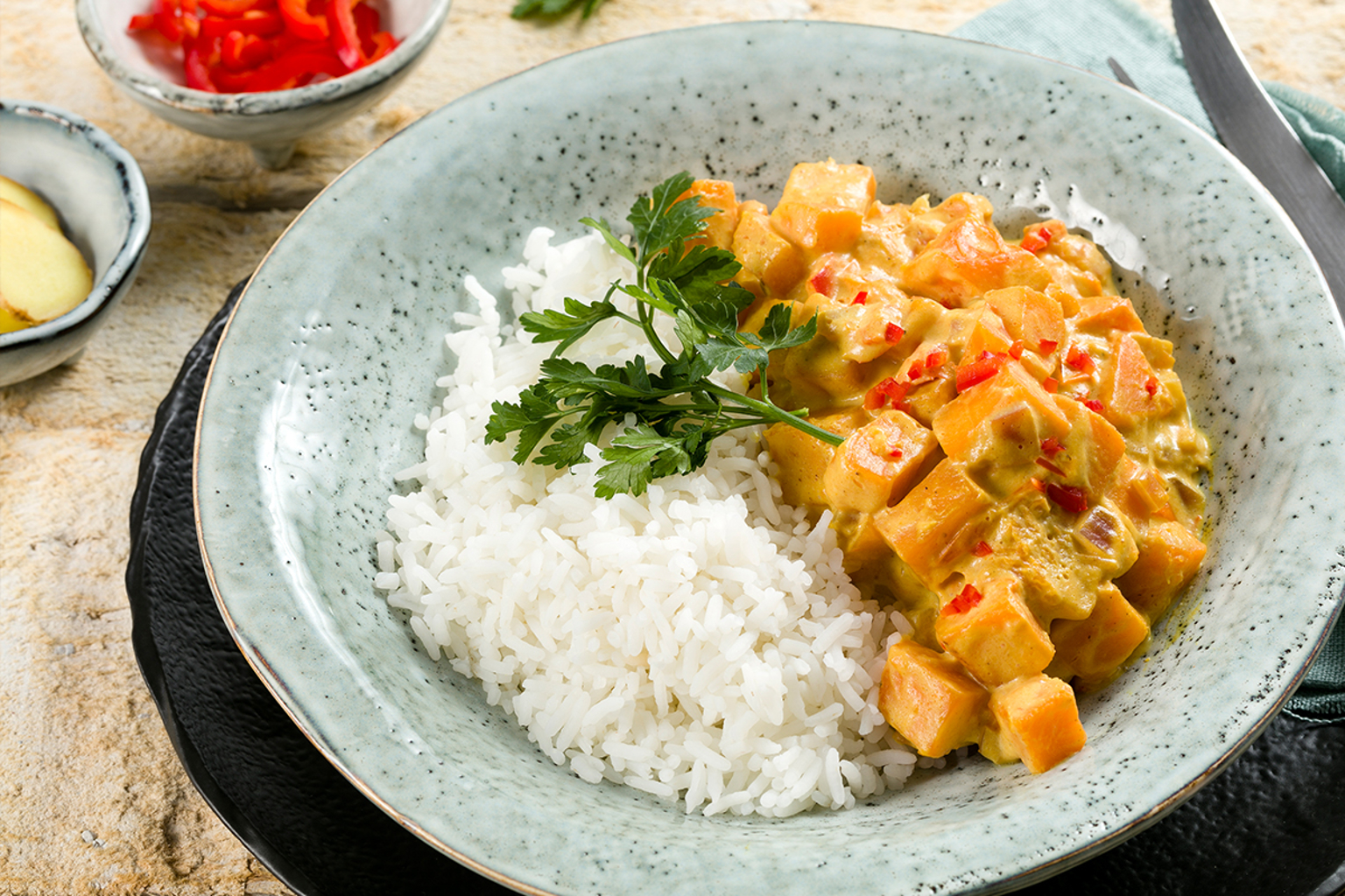 Tip 1: Voeg 3 cm geschilde en fijngesneden EAT ME gember toe aan de curry. Bak de gember mee met de ui, knoflook en cayenne peper. Dit geeft een extra frisse smaak aan de curry. Tip 2: Gebruik volkoren basmatirijst voor een extra vezelrijk gerecht.