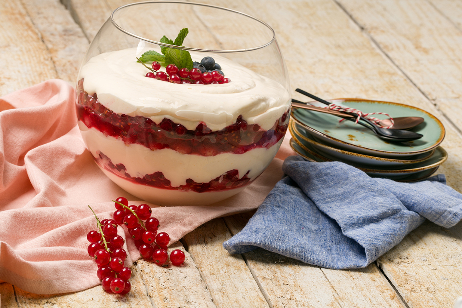 Verdeel een laag lange vingers over een kom of schaal, verdeel er ⅓ van de room en de helft van de bessen erover. Herhaal dit nog een keer. Laat de trifle minimaal 2 uur opstijven.