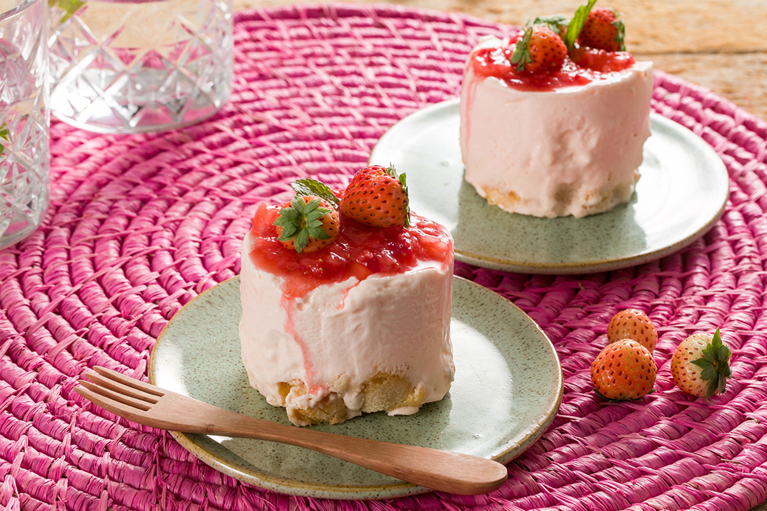 Klop de slagroom met de mascarpone stijf met de mixer in een mengkom. Spatel de afgekoelde aardbeienpuree er zo luchtig mogelijk door. Verdeel de aardbeienroom over de lange vingers en laat ze ca. 4 uur opstijven in de koelkast. Verwijder de taartringen en garneer de taartjes met de rest van de aardbeien, de ananas-aardbeien en munt.