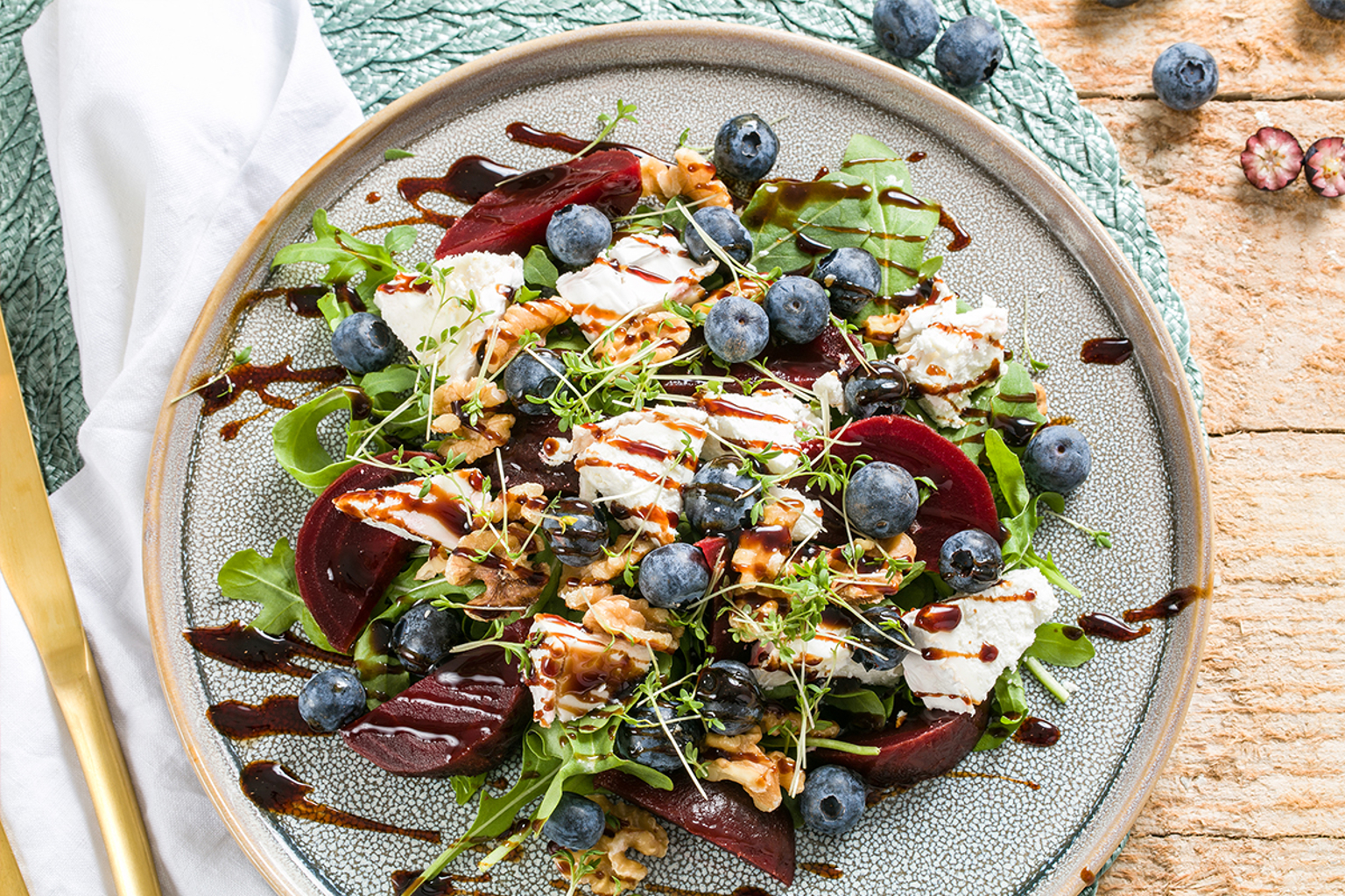 Geitenkaas combineert goed met rode bietjes maar ook met blauwe bessen. Een perfecte salade voor een warme zomeravond.