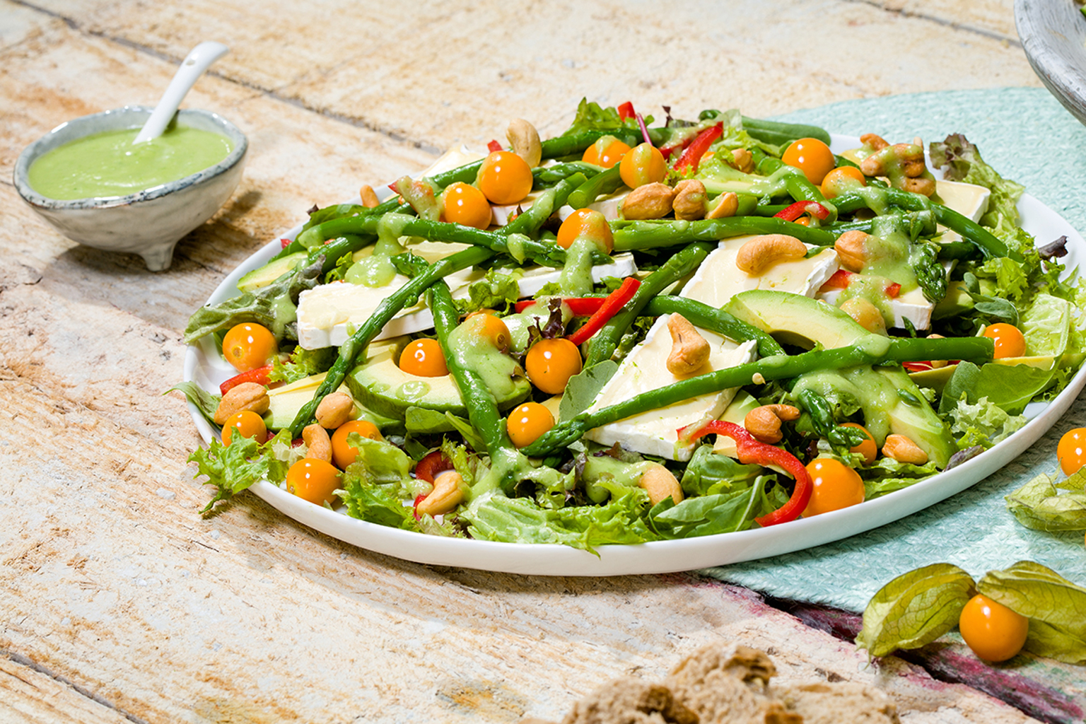 Verdeel de sla over een schaal of 2 borden. Verdeel de asperges, paprika, avocado en brie erover. Bestrooi met de physalis bessen en de cashewnoten.