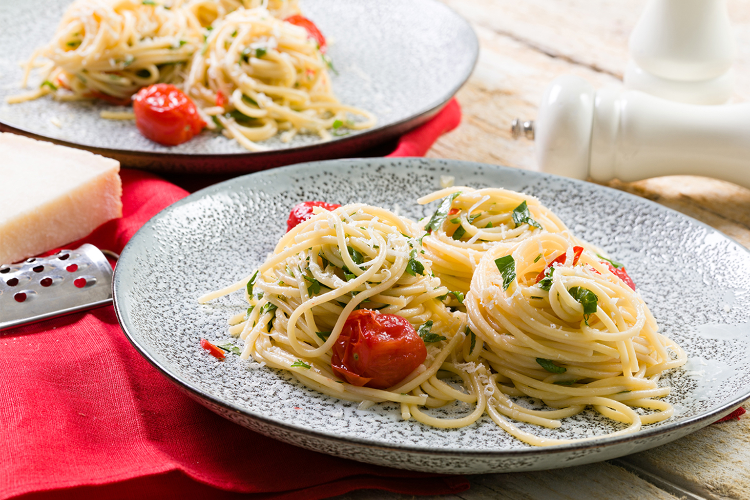 Verhit de olijfolie in een ruime koekenpan en fruit de knoflook en cayennepeper 2 minuten op laag vuur. Voeg de spaghetti, de peterselie en de helft van de kaas toe en schep nog 1 minuut om. Voeg de tomaten toe en verdeel over 4 borden. Bestrooi met de rest van de kaas.