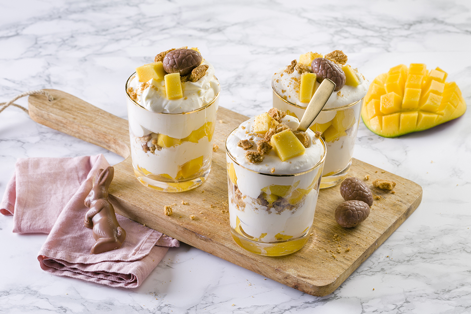 Houd wat mango en koekkruimels achter voor garnering. Verdeel de helft van de mango over 4 glazen, bestrooi met de helft van de koekkruimels en verdeel de helft van de yoghurtroom erover. Herhaal de lagen en garneer met mango, koekkruimels en een paasei.