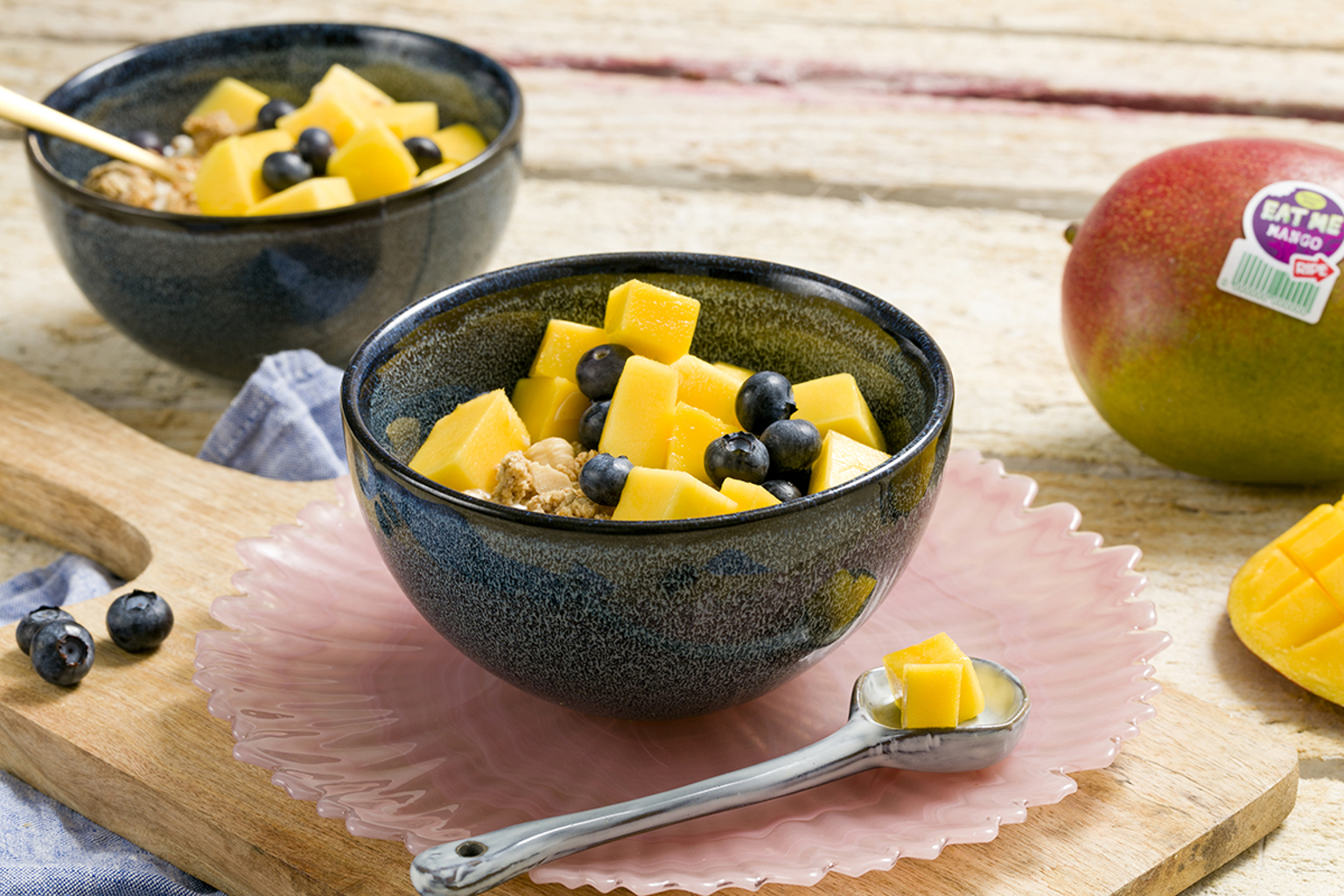 Een goed gevuld schaaltje yoghurt is een perfecte manier om je dag gezond te beginnen. Maak dit powerontbijt in een oogwenk en verwen jezelf met stukjes mango en blauwe bessen.