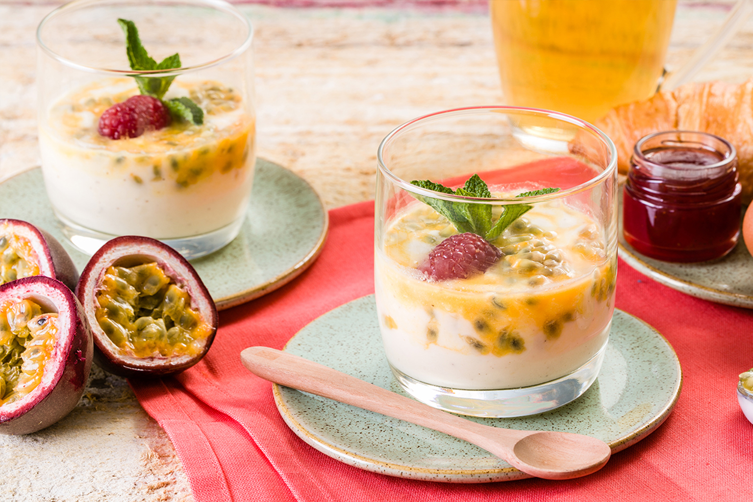 Een overheerlijk tropisch en makkelijk ontbijtje is de yoghurt met passievrucht. Schenk de yoghurt in de glaasjes en swirl de passiefruit erdoorheen. Ziet het er niet prachtig uit?