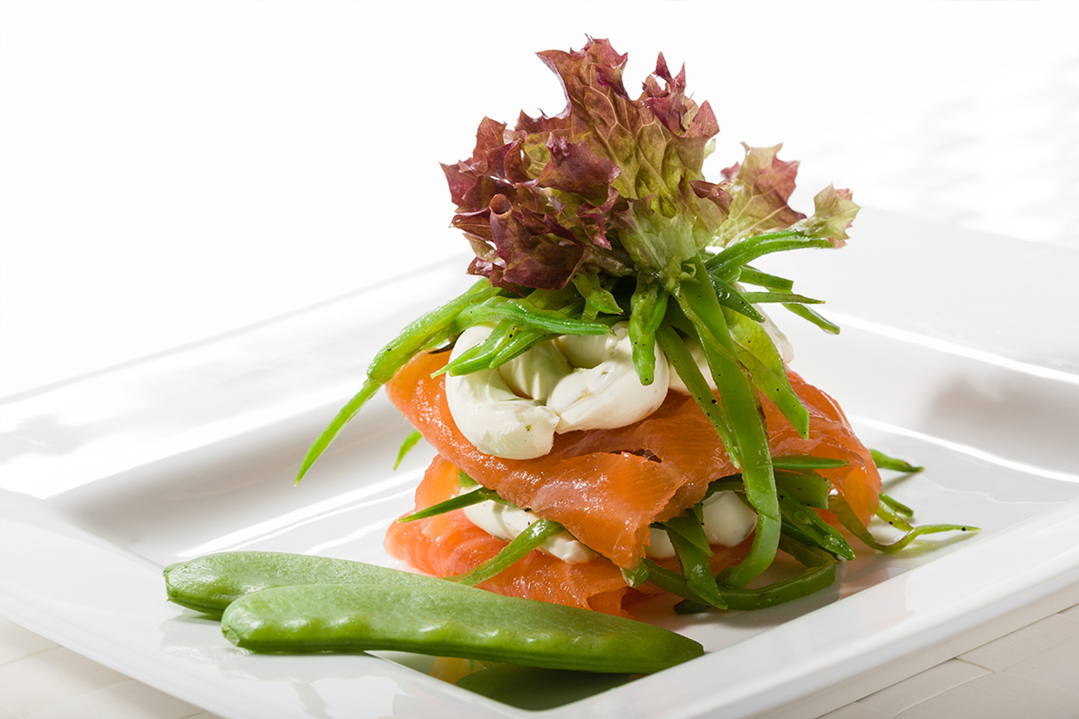 Snijd de zalm in 4 gelijke plakjes. Leg op twee bordjes een plakje dubbelgevouwen zalm, bestrijk met roomkaas en verdeel er wat peultjes over. Herhaal deze stap en garneer met de sla. Bestrooi met peper naar smaak.