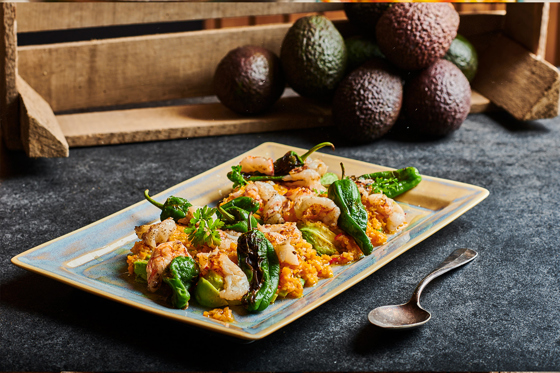 Salade van avocado, gegrilde gamba’s en padrone pepers met pompoendressing